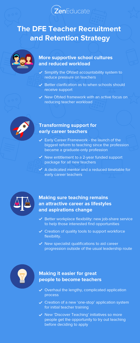The Department for Education’s first Teacher Recruitment and Retention Strategy was published in January 2019, and sets out a 4-point plan to overcome the key obstacles faced by teachers in Britain.